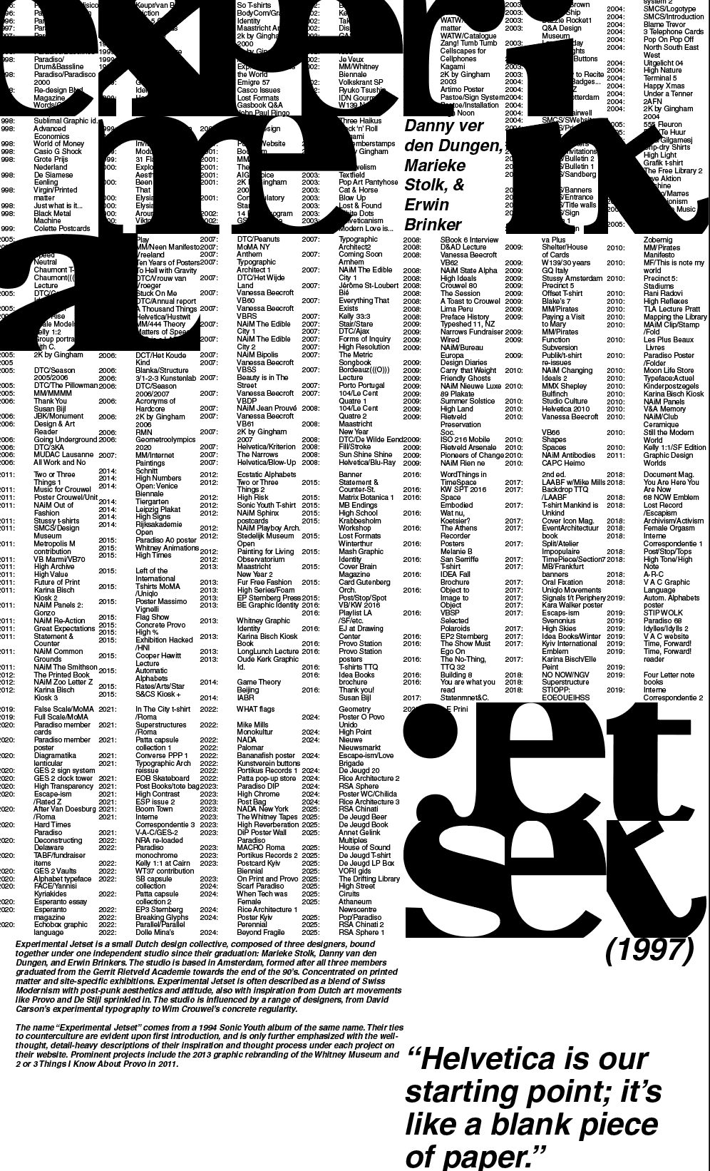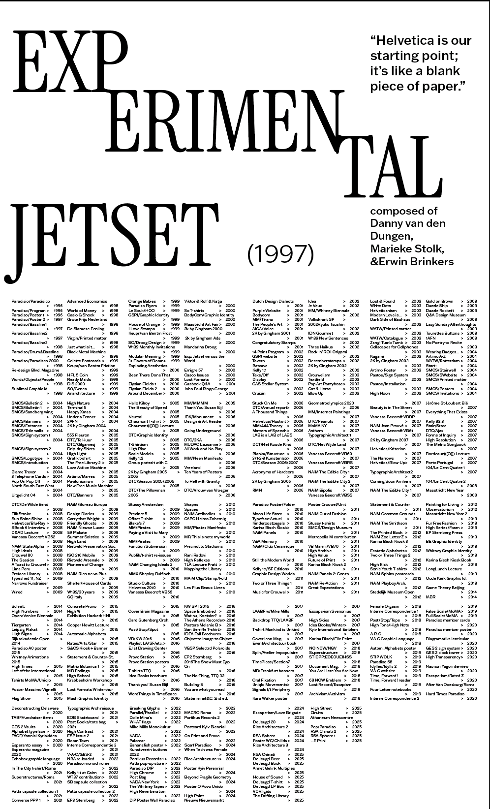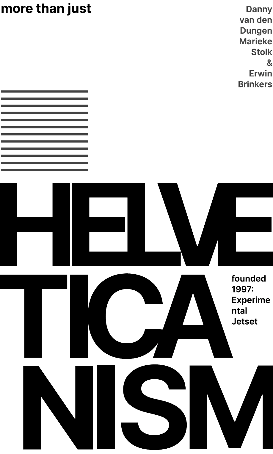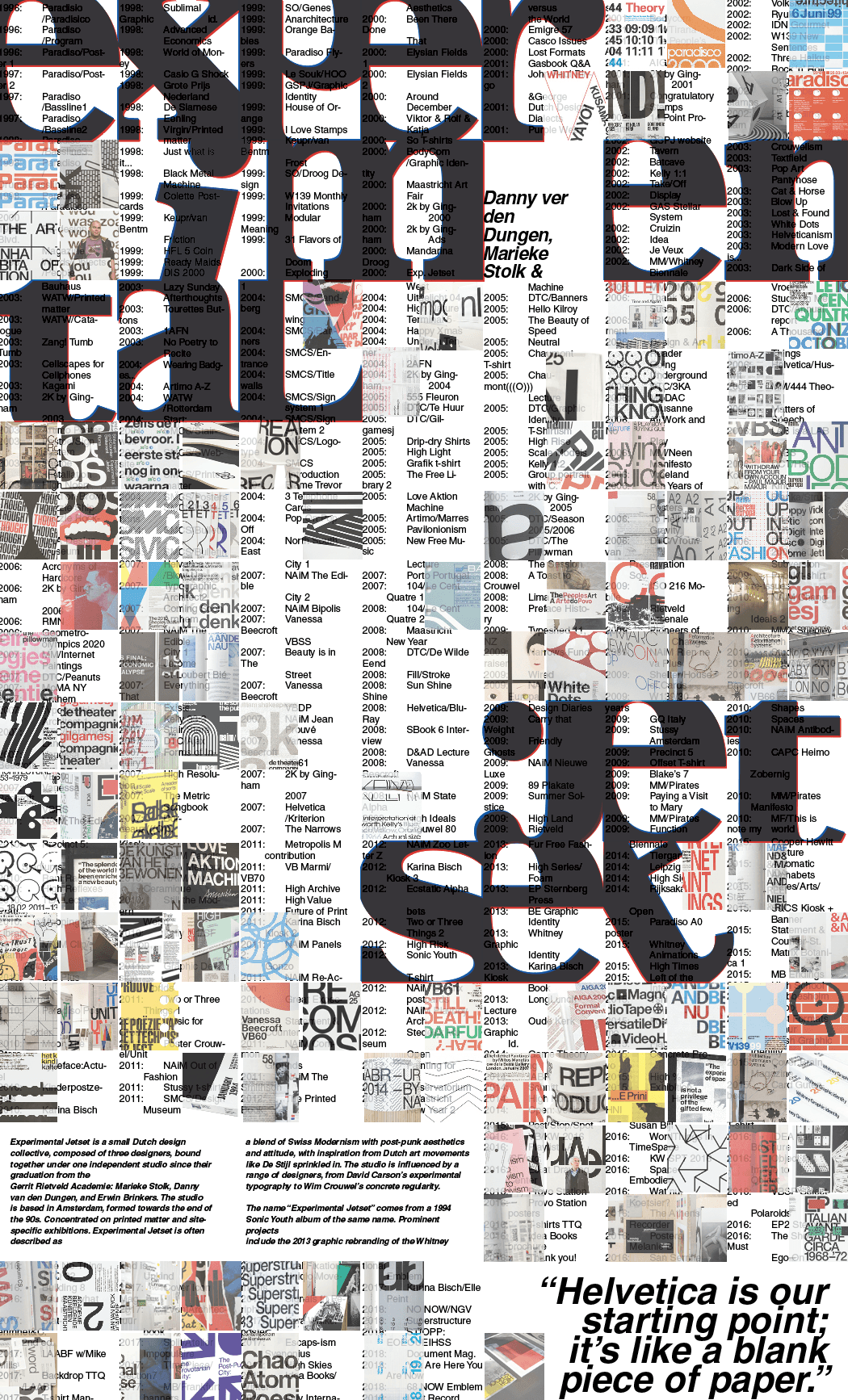 Experimental Jetset has a veritable archive of work and various projects. Other distinct features of their work is strong typography, neatly ordered and hierarchical layouts, and frequent use of the Neo-Grotesque sans serif: Helvetica.