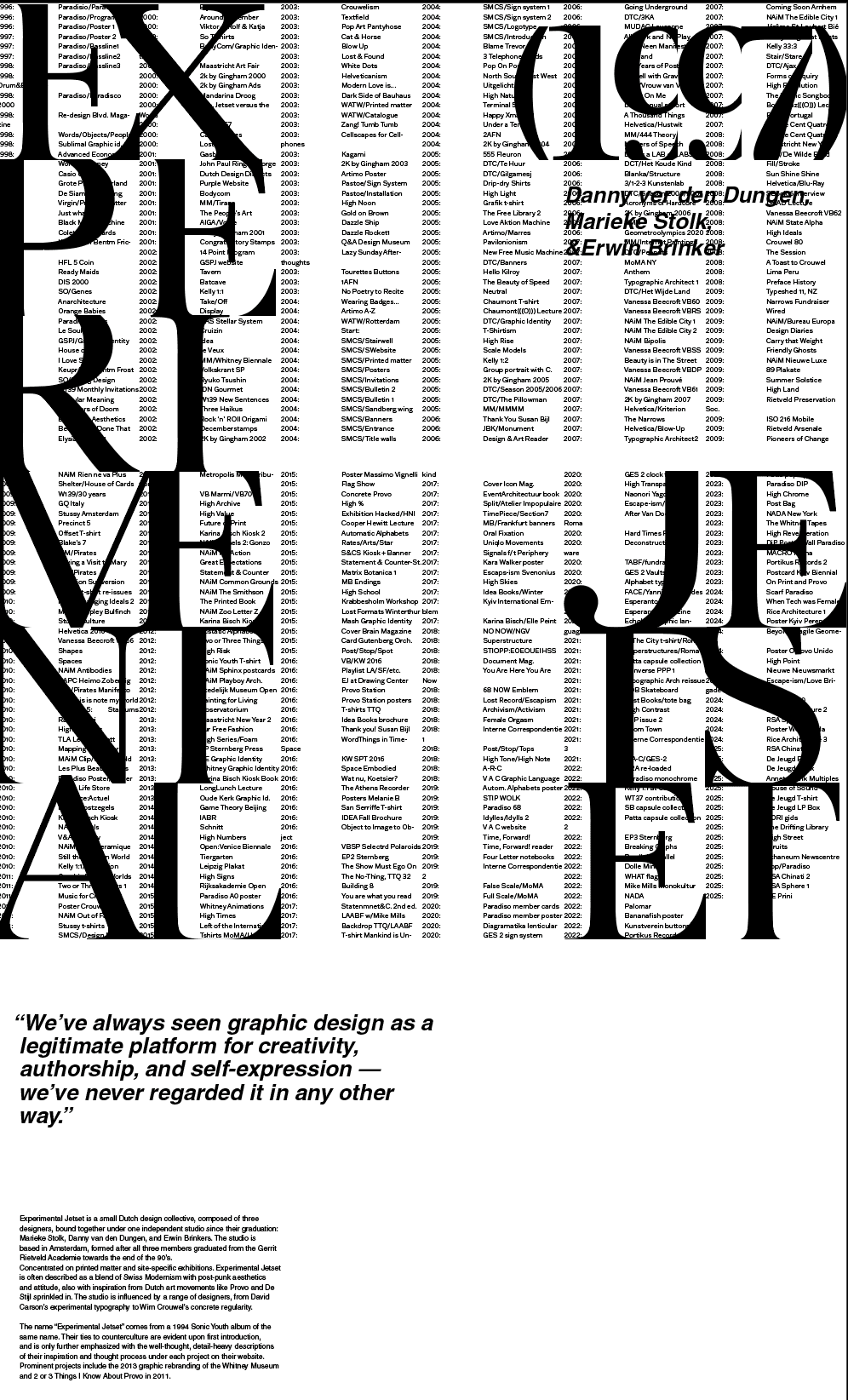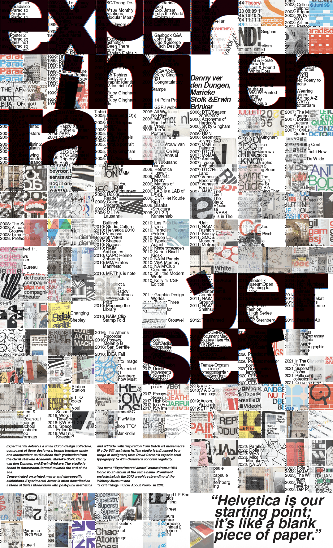 I overlaid cropped select images of their most distinct/defining works with the list of projects chronicled on the Experimental Jetset website (https://www.jetset.nl/) to convey the sheer scale through a flat, 2D poster medium.