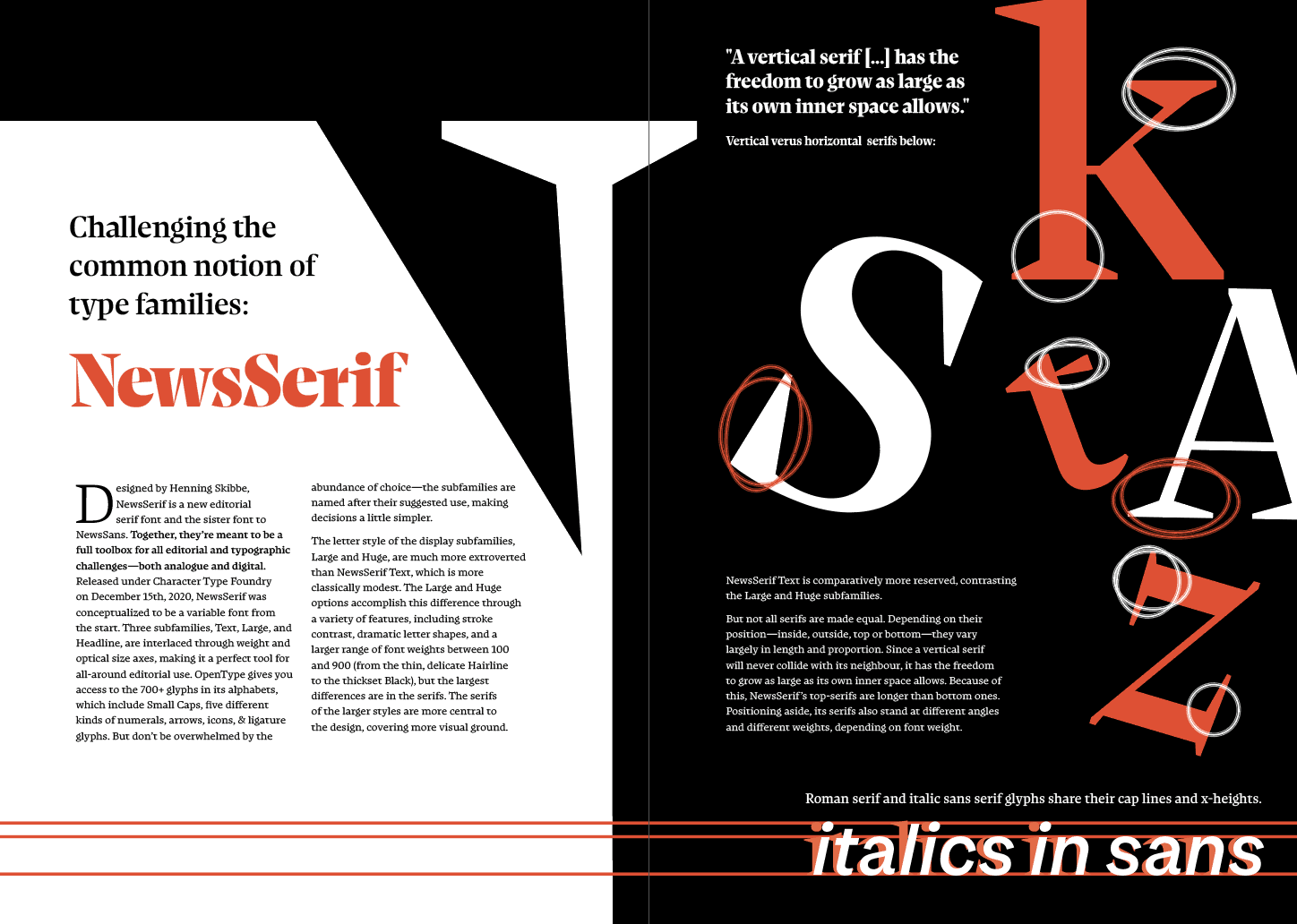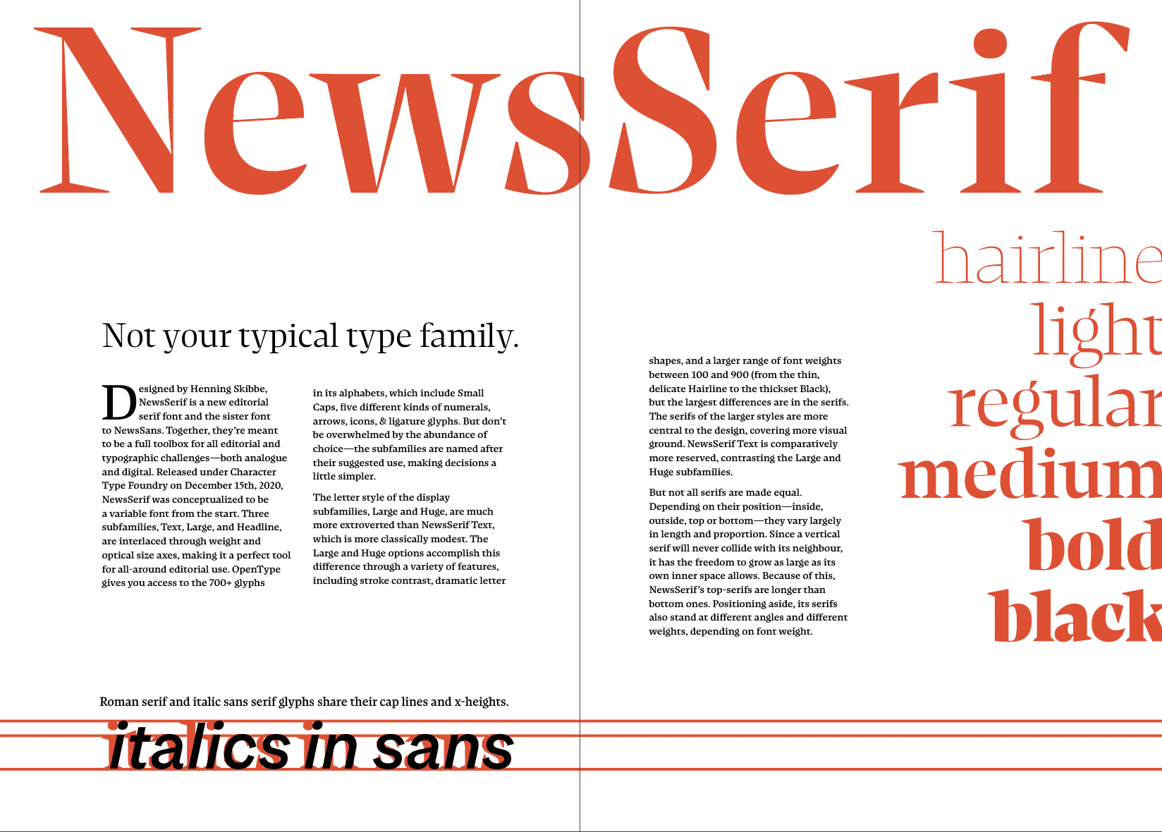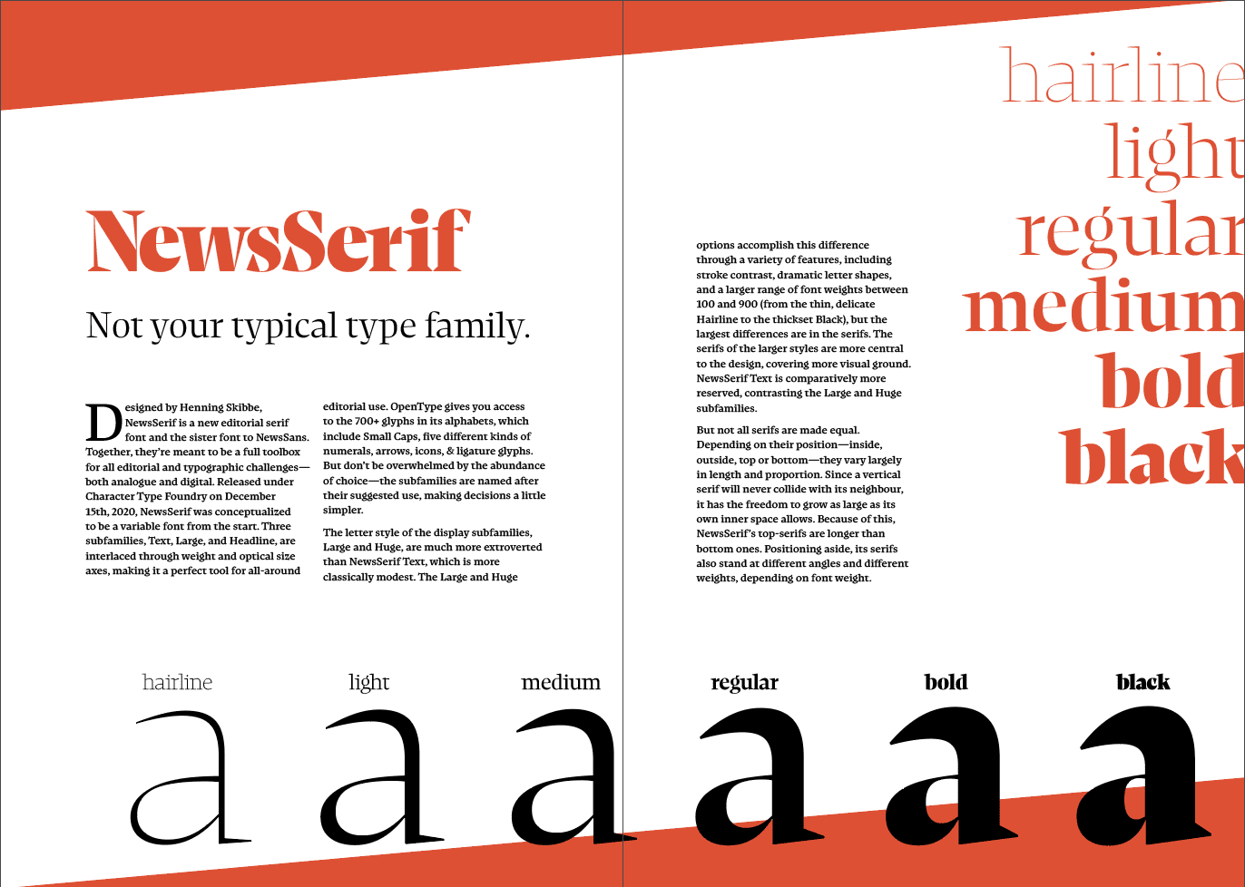 For the spread, I chose a color palette of black-and-white with a red as an accent color. I composed an essay about NewsSerif Variable's history and key qualities to use as the body copy of a four-page spread (one title page, a spread regarding the typeface in general, and its relevance to a certain assigned typographic term).