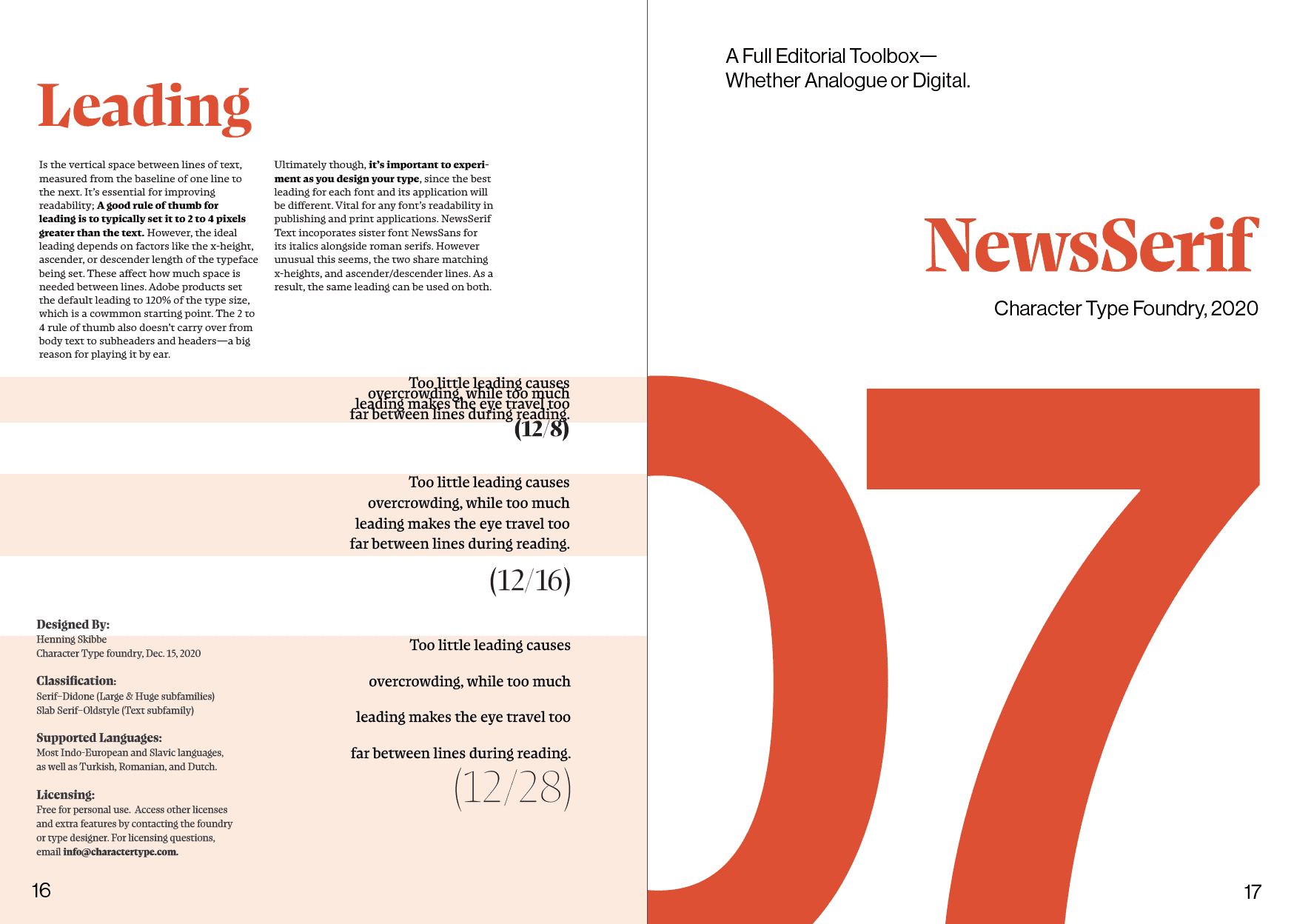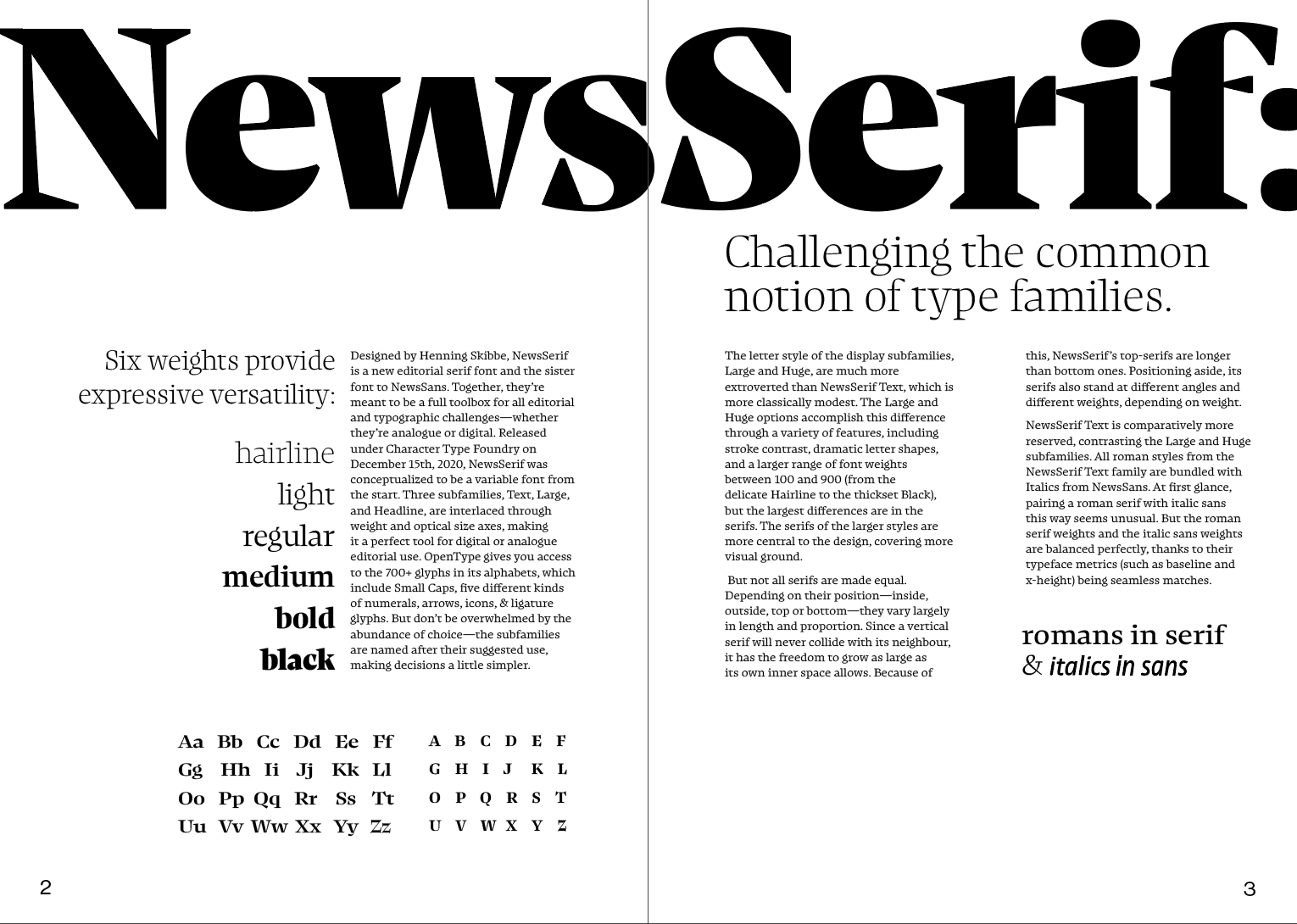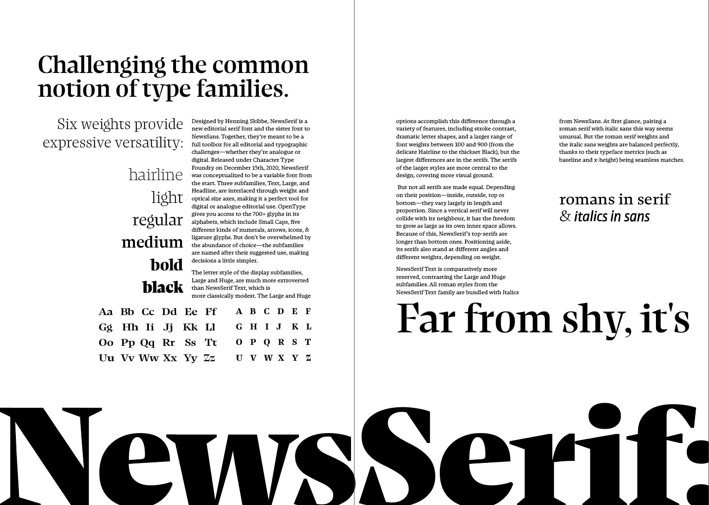 For the spread, I chose a color palette of black-and-white with a red as an accent color. I composed an essay about NewsSerif Variable's history and key qualities to use as the body copy of a four-page spread (one title page, a spread regarding the typeface in general, and its relevance to a certain assigned typographic term).